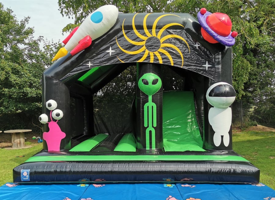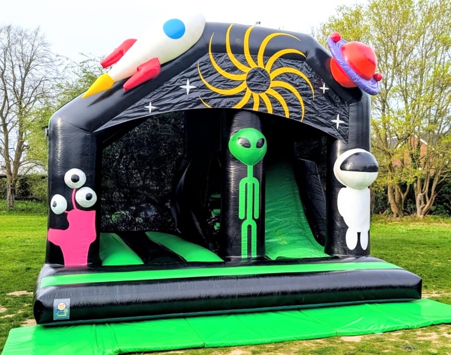 Bring something eye-catching to your event with this large space-themed bouncy castle with slide, featuring bright alien and space artwork.