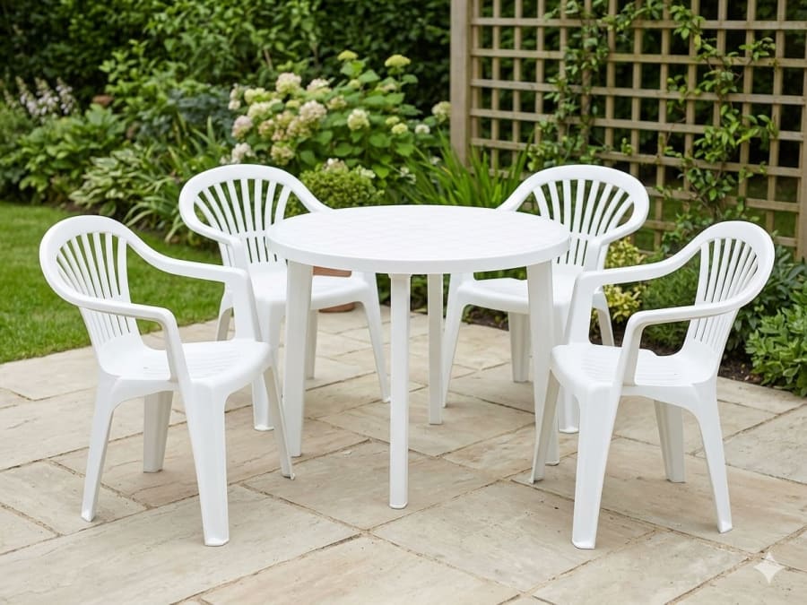 These white patio tables and chairs are lightweight yet durable, making them easy to set up and arrange in any outdoor space. Their clean, neutral design suits any theme or setting, from relaxed garden parties to formal outdoor dinners.